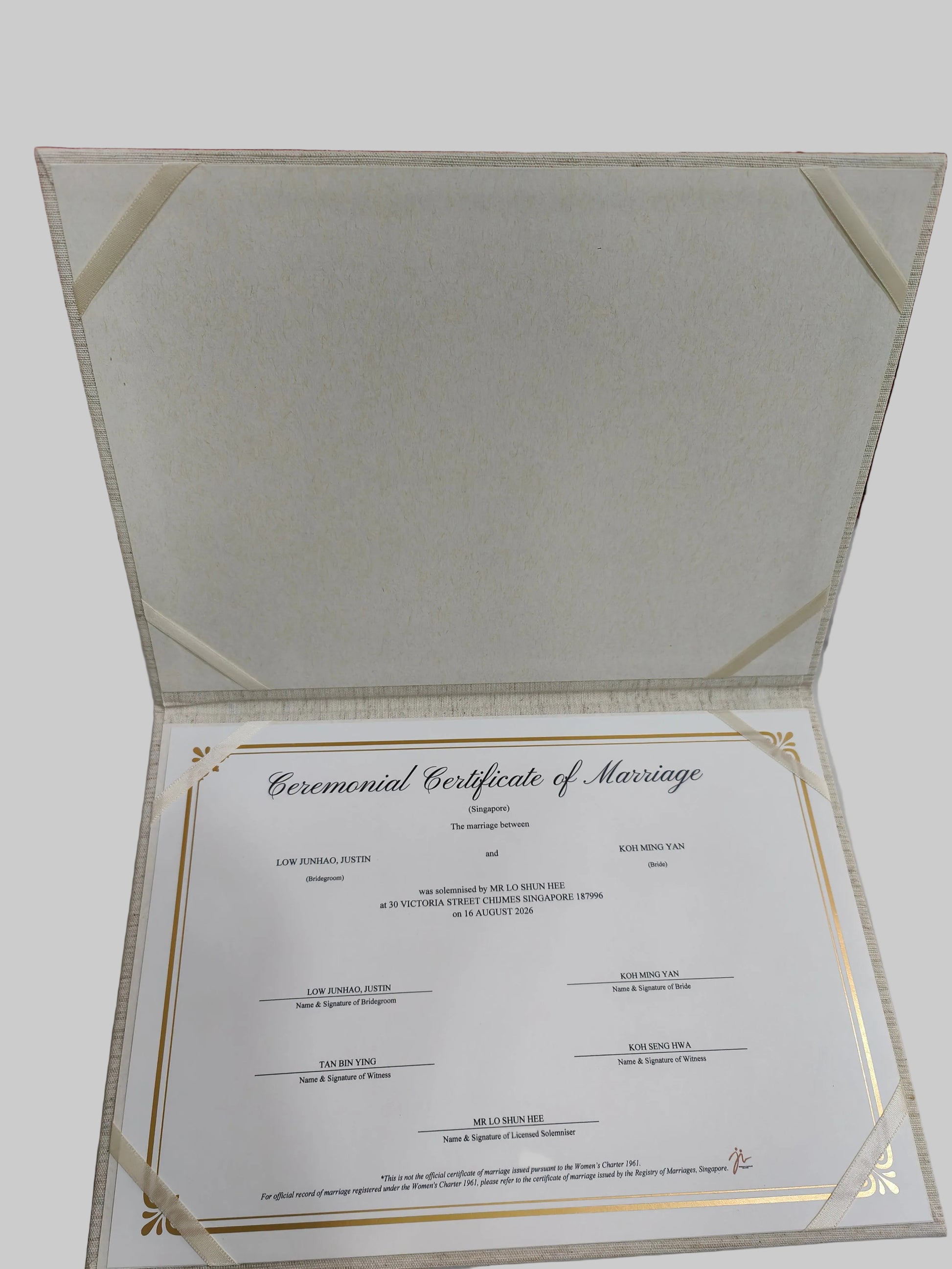 Once your order is placed, please send your Wedding Certificate (Registry of Marriage) in PDF format to us via email at service@wforwedding.com or via WhatsApp at 8614 5139.